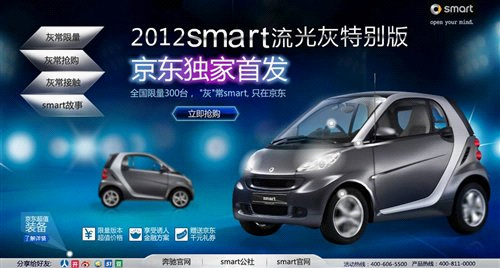 ????青島新聞網(wǎng)汽車(chē)訊 2012年2月10日,smart流光灰特別版正式上市,售價(jià)為149,888元,中國(guó)限量發(fā)行300臺(tái)。本次上市的smart流光灰特別版選擇京東商城作為其唯一銷(xiāo)售渠道。于2月10上午十點(diǎn)開(kāi)始銷(xiāo)售,采取網(wǎng)上搶拍,預(yù)付定金后到指定經(jīng)銷(xiāo)店辦理手續(xù)付尾款提車(chē)的方式。