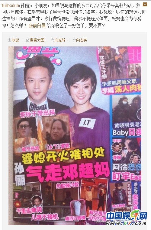某娛樂(lè)雜志爆料,稱(chēng)孫儷婆媳開(kāi)火難相處,氣走鄧超媽媽?zhuān)s志還指孫儷是都市惡媳婦,鄧超媽媽是鄉(xiāng)下婆婆,兩人難相處是因?yàn)槠牌艓O子惹出禍,雜志還附上照片,讓人感覺(jué)證據(jù)確鑿。孫儷看到雜志后大為發(fā)火,在微博上否認(rèn)婆媳不和的傳聞,指寫(xiě)稿的人想象力豐富,做這樣的工作有點(diǎn)屈才,應(yīng)該去做編劇。