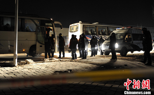 2月28日22時(shí)許,河北石家莊市趙縣生物產(chǎn)業(yè)園的河北克爾化工有限公司入口,特警正在換班。(中新社記者 翟羽佳 攝)