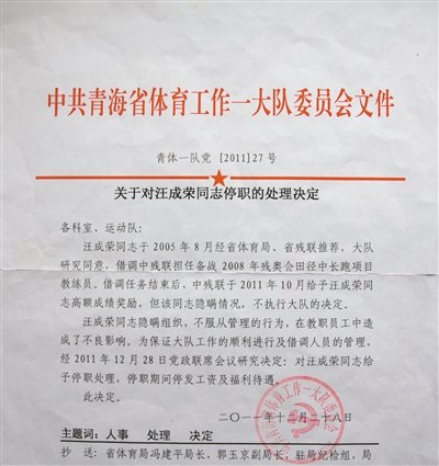 被約談多次,次次讓交錢 上交全部獎金,由青海體工一大隊進行再分配,自己分到手可能只有總獎金的20%,汪成榮不干 去年12月28日之前,汪成榮已有半個多月睡不好覺。被上級單位叫去談話多次,內(nèi)容只有一個:希望汪成榮把這筆獎金交給單位,由組織進行分配。 第一次談話,青海體工一大隊隊長楊海寧問他卡里打進多少獎金,汪成榮留了個心眼,說90萬元。汪成榮說,雖無書面說明,但據(jù)他了解,隊里已有分配方案,他只能拿到這筆獎金的20%,如按90萬元計算,自己拿18萬元,30萬元給青海省殘聯(lián),42萬元歸青海體工一大隊。 汪成榮認為,在借調(diào)到中殘聯(lián)帶隊期間,他和原單位從未就獎金分配一事有過任何協(xié)議,“只要拿出相關(guān)文件,說我該上交獎金,那我多少都交,要是拿不出文件,我一分錢也不交?!睏詈幏Q隊內(nèi)有相關(guān)文件,只是不便出示。關(guān)于獎金的再分配,楊海寧不肯細談,但表示不會留給某個人,“方方面面都要考慮到,你以為這是一個人的事?多少人為你服務(wù)呢?原單位不派你出去,派個阿貓阿狗出去也一樣的。” 2011年12月28日,青海體工一大隊黨委下發(fā)了《關(guān)于對汪成榮同志停職的處理決定》,該文件稱:“中殘聯(lián)于2011年10月給予汪成榮同志高額成績獎勵,但該同志隱瞞情況,不執(zhí)行大隊的決定。汪成榮同志隱瞞組織、不服從管理的行為,在教職員工中造成了不良影響?!蓖舫蓸s被停職,停職期間停發(fā)工資及福利待遇。 汪成榮依然沒有上交獎金,“這是中殘聯(lián)獎勵給我個人的錢,憑什么讓我往外拿?” 通知發(fā)4次,雙方仍僵持 “停職決定”未能奏效,汪成榮依然沒有交錢,青海體工一大隊又連發(fā)了4次通知 為照顧妻兒,汪成榮2010年7月申請換崗到科室工作,這樣他每天都可以回家。 汪成榮和孫英杰每月工資加起來超過5000元,這份收入在西寧能過上不錯的生活。除了西寧有房子,孫英杰九運會時在北京被獎勵了一套房子;他們還有一輛福特車。2010年8月8日出生的兒子,如今已能在兒童籃架上扣籃。 如果沒有這件事,汪成榮的生活很規(guī)律,6點起床、做飯,8點坐班車,9點抵達20多公里外的多巴基地,午飯在基地食堂吃,下午5點下班,6點到家、做飯。但如今,他的生活變了,“每天睡不著,最早也要凌晨兩點?!?/p> 繼“停職決定”后,青海體工一大隊又連發(fā)4次通知,要求汪成榮“說明情況”。2月7日,通知要求汪成榮提交“參加2008年北京殘奧會有關(guān)情況”的書面報告;2月13日,要求將外借期間比賽的獎金數(shù)額、北京殘奧會獲得的總獎金數(shù)額如實匯報并提供票證依據(jù);2月17日,要求汪成榮上報所得獎金準確數(shù)額;2月23日,第4份通知稱,“外派執(zhí)教屬職務(wù)行為,大隊有權(quán)知曉外派者的工作情況,包括獎金收入,外派工作者如實匯報是必須履行的義務(wù)”。 據(jù)體工隊工作人員介紹,汪成榮的停職決定貼得到處都是。還有人說,原本不知道這事,正月十三去領(lǐng)元宵,本想幫汪成榮代領(lǐng),但人家說汪已經(jīng)沒這福利了。 汪成榮試圖讓自己的態(tài)度和緩一些,每次都按時回函,但他強調(diào),自己不能提供獎金數(shù)額,希望上級部門向中殘聯(lián)體育部發(fā)函確認,“他們心虛,不敢向別人問這個錢。” 楊海寧表示,并非只要求汪成榮交回獎金,其他教練的獎金也要重新分配。但汪成榮認為這是給他下的套,且獎金數(shù)額也相差甚遠,“確實有幾個教練的獎金被收了,但數(shù)額差太遠了,有個4萬多的,有個1萬多的,有個4千多的,還有個1千多的?!?/p> 獎金近一半,被用于購房 一份中殘聯(lián)的函顯示,149.91萬元被認定為“教練員獎金”,但青海體工一大隊并未罷手 記者2月29日上午采訪負責發(fā)放獎金的中殘聯(lián)體育部時,一位王姓工作人員表示,有關(guān)“獎金到底是發(fā)給誰”的問題,需要請示上級領(lǐng)導。之后,記者多次致電,仍再無正面回應(yīng)。在汪成榮提供的一份名為《關(guān)于下發(fā)第13屆殘奧會中國體育代表團教練員獎金的函》中,中殘聯(lián)體育部把打給汪成榮的149.91萬元認定為“教練員獎金”,時間是2011年12月22日。 汪成榮說,他和其他借調(diào)的教練聯(lián)系過,“據(jù)我所知,其他教練沒這事兒。” 上海田徑教練張敏珍曾兩度被借調(diào)到中殘聯(lián),帶隊參加了雅典殘奧會和北京殘奧會,其弟子吳春苗曾在2004年殘奧會上奪得1金1銀。她稱此事不可理解,“獎金已打到了我自己的卡里,這是個人收入,我的上級單位沒和我要。在汪成榮之前,我也沒聽過這樣的事?!?/p> 教練員金帆曾帶出了兩屆殘奧會F11三級跳金牌得主李端,他接受采訪時表示:“我參加過兩屆殘奧會,這種獎金是給我們借調(diào)去的教練的,不是給我們單位的?!?/p> 離開田徑場兩年多的孫英杰,曾在10年前打破兩項亞運會紀錄,并經(jīng)歷過興奮劑事件和討薪事件。她對發(fā)生在丈夫身上的事感到不解,她說,丈夫單位要這筆錢,根本沒有正當理由。 楊海寧稱,如果汪成榮上交這筆錢,事情還有和緩的余地,“這對他個人也有利,我們會覺得這個人人品不錯,比較誠實,會給他放在合適的崗位上,也會好好培養(yǎng)他,給他‘壓擔子’?!?/p> 事實上,這筆錢已經(jīng)被汪成榮夫婦花掉了近一半,他們在西寧市中心買了一套新房,高層,帶電梯,每平米5800元,總價67萬,手續(xù)費1萬元,裝