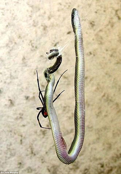 蜘蛛輕松的將這條14厘米長的蛇作為美味大餐 【搜狐科學(xué)消息】據(jù)國外媒體報道,如果天生患有“蜘蛛恐懼癥”的人們聽到這個消息,相信一定會將南非視為噩夢般的地域了。據(jù)國外媒體報道,南非某公司的一位工作人員,在其辦公桌旁瞥見了驚人一幕:即一只蜘蛛將一條14厘米長的家蛇當做早餐狼吞虎咽的吞掉。據(jù)這位目擊者表示,這只蜘蛛為這場“謀殺”已經(jīng)精心籌備了兩天之久,這片蜘蛛網(wǎng)就是它花了兩天時間“編織”而成的。 據(jù)了解,這位目擊者名為塔尼爾—羅伯特遜(Tania Robertson),她是南非一家電力公司的職員,這個場景讓她感到十分震驚。她說道,那天她去公司上班時,無意瞥向辦公桌,就看到了這驚人場景。當時她完全被現(xiàn)場震驚了,因為她還是第一次眼睜睜的看見蜘蛛一口口的將蛇吃掉。而且,最為不可思議的是,這條14cm長的蛇牢牢的被蜘蛛網(wǎng)所纏住,無絲毫反抗之力的懸在了半空中。沒過多久,這只蜘蛛就狼吞虎咽的將這條蛇全部消滅干凈,或許這是它這一天的一頓大餐了。羅伯特遜還表示,這只蜘蛛似乎早早就開始進行這次“謀殺”的籌備工作了,因為兩天前它就開始就在一個離地面較高的地方織網(wǎng),在這期間還有不少小的獵物被粘在網(wǎng)上,成為它的小點心。甚至在某一時刻,這只蜘蛛對意外落在網(wǎng)上的蒼蠅都會帶有很強的攻擊反映,只要蜘蛛發(fā)現(xiàn)了無意中落入“圈套”的獵物,就會毫不留情的將它們?nèi)肯麥绲簟?/p>