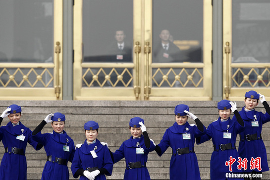 ????3月4日上午,十一屆全國人大五次會議預備會議在北京人民大會堂舉行。等候人大代表的禮儀小姐在人民大會堂門口擺造型留影。中新社記者 盛佳鵬 攝