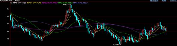 ????美元指數(shù)周評(píng) ??????本周美國(guó)經(jīng)濟(jì)數(shù)據(jù)的持續(xù)好轉(zhuǎn)令第三輪量化寬松政策帶來(lái)不確定性,刺激美元反彈上行,美元指數(shù)報(bào)79.43美元逼近80美元大關(guān),美元周K線報(bào)收中陽(yáng)線,出現(xiàn)企穩(wěn)上行跡象,下周初級(jí)支撐位78.86美元,阻力位79.71美元,越過(guò)則將上試80美元大關(guān),由于技術(shù)面提示美元有構(gòu)筑中期底部趨勢(shì),短期將維持震蕩上行格局,下周建議低多。