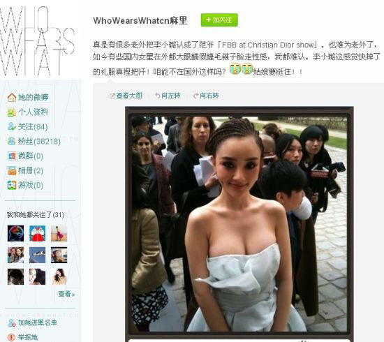 3月3日凌晨零時30分,名為“WhoWearsWhatcn麻里”的新浪微博網(wǎng)友在微博中曬出一張外國時尚雜志的截圖,照片中是李小璐穿著爆乳抹胸小洋裙,一臉微笑的面對鏡頭。而外媒的圖注則寫著:“Fan Bingbing at the Christian Dior show。”