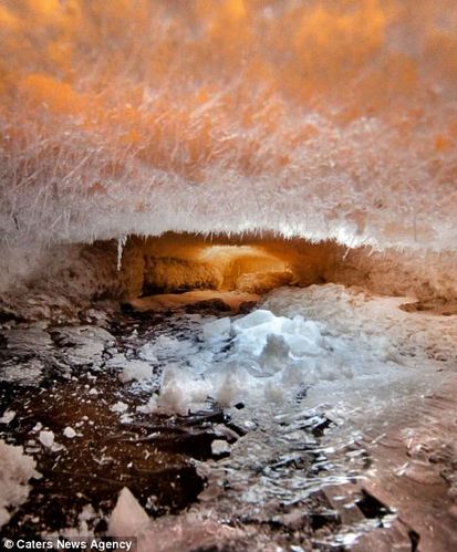 ????俄羅斯攝影師Yuri Ovchinnikov拍攝到的Tianuksa冰封后的河底風(fēng)光,層層疊疊的冰層,林立的冰柱閃動(dòng)著耀眼的光芒,仿若夢幻的冰河世界。能夠拍攝到這么震撼的場景要感謝攝影師Yuri Ovchinnikov的兒子,是他的腳掉踩到了冰洞了才發(fā)現(xiàn)了這個(gè)世界。