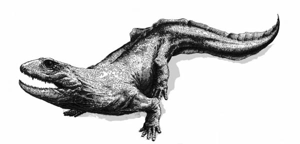 化石群中一類兩棲動物的復(fù)原圖(芝加哥大學(xué)及蘇格蘭博物館的Michael Coates繪) 來自劍橋大學(xué)動物學(xué)博物館的Jennifer Clack和古生物學(xué)家Stanley P. Wood領(lǐng)導(dǎo)的研究團(tuán)隊(duì),在蘇格蘭發(fā)現(xiàn)了一個(gè)新的化石群,它們生存于3.45~3.6億年前之間的1500萬年內(nèi),這一時(shí)期曾一度被認(rèn)為生命極度貧乏,僅有海洋生物生存。由于化石發(fā)現(xiàn)極少(僅有一副骨架及其他零星骨骼化石被發(fā)現(xiàn)),古生物學(xué)家一直認(rèn)為在3.59億年前的一次大滅絕事件之后的一段時(shí)間內(nèi)生命貧乏。為解釋這一現(xiàn)象,有學(xué)者猜測這一時(shí)期大氣含氧量極低,以致無法支撐生命存在。這一新的發(fā)現(xiàn)填補(bǔ)了地史上的空白,推翻了前人的理論,具有重要的意義。 這個(gè)化石群發(fā)現(xiàn)于蘇格蘭邊境地區(qū)(Scottish Borders,位于愛丁堡東部的政府直轄區(qū)),由上百件植物及動物化石組成,其中一些動物化石發(fā)育有腳趾,這也改寫了腳趾的出現(xiàn)歷史。美國古生物學(xué)家Alfred Sherwood Romer曾提出“柔默空缺”(Romer's Gap),即指化石記錄存在的這段空缺,但Wood卻始終相信,造成這一空缺的原因是化石記錄的未發(fā)現(xiàn),而不是進(jìn)化史上這一時(shí)期本身就沒有生命存在。正是這一信念支撐著他在二十年內(nèi)不斷發(fā)掘,最終,這一化石群的發(fā)現(xiàn)使他的付出獲得了回報(bào)。BBC正打算拍攝與這一發(fā)現(xiàn)相關(guān)的專輯,而這些化石也將被送往位于愛丁堡的蘇格蘭自然博物館展出。