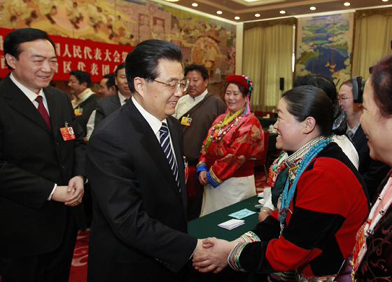 3月9日,中共中央總書(shū)記、國(guó)家主席、中央軍委主席胡錦濤參加十一屆全國(guó)人大五次會(huì)議西藏代表團(tuán)的審議。這是胡錦濤同代表們親切交談。鞠鵬攝