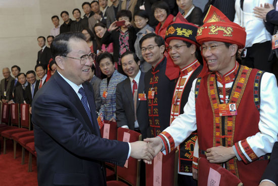 3月9日,中共中央政治局常委李長春參加十一屆全國人大五次會(huì)議海南代表團(tuán)的審議。新華社記者 張鐸攝 在海南代表團(tuán),李長春同代表們一起審議。會(huì)上,羅保銘、蔣定之、李建保等代表就海南國際旅游島建設(shè)、發(fā)展文化旅游產(chǎn)業(yè)、弘揚(yáng)雷鋒精神等發(fā)表了意見。李長春認(rèn)真傾聽,不時(shí)插話,與大家互動(dòng)交流。在聽取代表們發(fā)言后,李長春作了發(fā)言,對(duì)海南經(jīng)濟(jì)社會(huì)發(fā)展取得的成績給予充分肯定,希望海南進(jìn)一步興起貫徹落實(shí)黨的十七屆六中全會(huì)精神新高潮,抓住機(jī)遇、乘勢而上,把國際旅游島建設(shè)與文化建設(shè)更好結(jié)合起來,加快建設(shè)廉潔高效的政務(wù)環(huán)境、民主公正的法治環(huán)境、公平誠信的市場環(huán)境、安全穩(wěn)定的社會(huì)環(huán)境、舒適便利的生活環(huán)境、健康向上的人文環(huán)境,不斷提升公民思想道德素質(zhì)和社會(huì)文明程度,使國際旅游島成為展示良好文明素質(zhì)的窗口。李長春強(qiáng)調(diào),文化和旅游密不可分、相輔相成,文化是旅游之“魂”,旅游是文化之“體”。他希望海南發(fā)揮文化產(chǎn)業(yè)優(yōu)化結(jié)構(gòu)、擴(kuò)大消費(fèi)、增加就業(yè)、推動(dòng)可持續(xù)發(fā)展、促進(jìn)跨越式發(fā)展的獨(dú)特優(yōu)勢,推動(dòng)文化資源與市場相融合,使文化產(chǎn)業(yè)與旅游業(yè)相互促進(jìn)、共同發(fā)展。 |