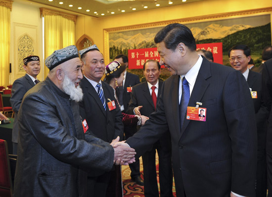 3月9日,中共中央政治局常委、國家副主席習近平參加十一屆全國人大五次會議新疆代表團的審議。新華社記者 王曄 攝 在新疆代表團,習近平同代表們一起審議。代表們圍繞會議議題暢所欲言,會場氣氛活躍。習近平在認真聽取張春賢、努爾·白克力、馬寧·再尼勒等代表發(fā)言后指出,新疆工作在黨和國家工作全局中具有特殊重要的戰(zhàn)略地位。他希望自治區(qū)黨委政府、生產(chǎn)建設兵團團結(jié)帶領全疆各族干部群眾,按照中央新疆工作座談會決策部署,毫不動搖地堅持發(fā)展和穩(wěn)定兩手抓、兩手都要硬,譜寫科學發(fā)展、穩(wěn)疆興疆、富民固邊新篇章。要突出抓好科學發(fā)展,充分利用國家政策支持和全國各地支援,充分發(fā)揮自身比較優(yōu)勢和后發(fā)優(yōu)勢,走出一條質(zhì)量高、效益好、老百姓受益大的科學發(fā)展之路;切實保障和改善民生,讓新疆各族干部群眾更多更好地共享改革發(fā)展成果;始終高舉團結(jié)穩(wěn)定旗幟,牢固樹立“四個認同”、“三個離不開”思想,自覺維護民族團結(jié),堅決反對民族分裂,確保新疆社會大局持續(xù)穩(wěn)定。習近平還強調(diào),做好新疆工作不僅是新疆的事情,也是全黨全國的事情。各地區(qū)各部門要一如既往地加大對新疆的支持力度,做新疆跨越式發(fā)展和長治久安的參與者、推動者。 |