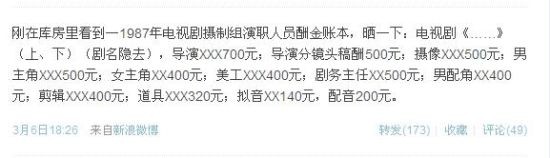 上海電影家協(xié)會(huì)副主席石川在微博截圖 近日,上海電影家協(xié)會(huì)副主席石川在微博上曬出了一張1987年某電視劇攝制組演職人員酬金賬本。業(yè)內(nèi)人士紛紛感慨那時(shí)的幕后人員報(bào)酬真高,而現(xiàn)在的電影拍攝已經(jīng)差不多是明星主導(dǎo)了。 在石川上傳的微博賬本中清晰地寫(xiě)到,某電視劇薪酬分配:導(dǎo)演700元,導(dǎo)演分鏡頭、攝像和男主角都是500元,而女主角、美工、男配角、剪輯師則是400元,其他的諸如道具、擬音、配音等人員也有相對(duì)不菲的薪酬。這條微博傳出后,有人感嘆當(dāng)年演員不容易,也有人覺(jué)得當(dāng)年的薪資分配比較合理,而現(xiàn)在完全進(jìn)入了明星主導(dǎo)電影的時(shí)代。網(wǎng)友“尋滬”說(shuō):“那時(shí)候,演職人員僅僅是一份職業(yè)而已。而且對(duì)于當(dāng)時(shí)的物價(jià)來(lái)說(shuō),500元也算是非常高的收入了。” 據(jù)中視天闊攝像工作室總經(jīng)理王學(xué)慶說(shuō):“老版的《西游記》拍了6年,給了孫悟空的扮演者共2000元人民幣,而且?guī)熗綆兹硕际悄敲炊??!蹦秤耙暜a(chǎn)業(yè)內(nèi)部人員告訴記者,現(xiàn)在拍一部電視劇,主角拿走大部分的資金,動(dòng)輒幾十萬(wàn)一集。而導(dǎo)演雖然收入略次于他們,也不少,而演職人員大部分都是按天拿工資,沒(méi)什么可比性。他說(shuō):“現(xiàn)在這種情況是市場(chǎng)發(fā)展導(dǎo)致的,觀眾需要明星來(lái)吸引,自然片酬會(huì)水漲船高。” |