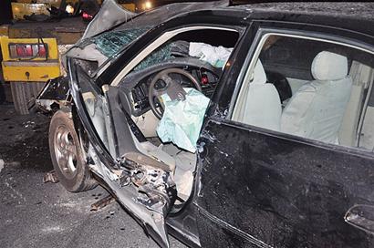 “剛在黑龍江中路上王埠村北的公交車站附近,一輛黑色的現(xiàn)代轎車跟一輛河北牌照的大貨車撞在了一起,現(xiàn)代轎車車頭扭曲變形,車里還有3人被困住了?!鼻巴?0時左右,市民王先生撥打早報熱線82888000報料。記者聞訊趕到現(xiàn)場時看到,一輛黑色的轎車停在黑龍江中路北向南的車道中央,車頭前部被撞凹陷,車前蓋掀起,車門扭曲變形,前擋風玻璃和車燈、保險杠被撞得粉碎,玻璃碎片和車身零件散落一地。車內(nèi)安全氣囊全部打開,大量黑色的機油漏出,記者發(fā)現(xiàn)車邊這灘機油中能看出斑斑血跡。