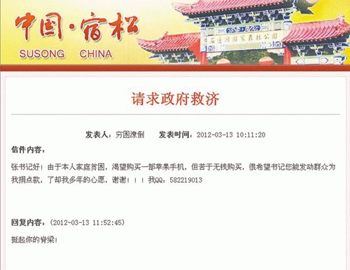 核心提示:昨日上午,一網(wǎng)友給宿松縣委書(shū)記寫(xiě)信稱(chēng),希望大家捐款給他買(mǎi)一部蘋(píng)果手機(jī),并得到書(shū)記的幽默回復(fù),引來(lái)無(wú)數(shù)網(wǎng)友圍觀。眾人驚呼寫(xiě)信者“太有才了!” 為了買(mǎi)一臺(tái)iPad,有人不惜“傾家蕩產(chǎn)”,這種事不管你信不信,去年發(fā)生了;為了買(mǎi)一部iPhone,有人向縣委書(shū)記求助,這種事不管你信不信,昨天發(fā)生了。昨日上午,一網(wǎng)友給宿松縣委書(shū)記寫(xiě)信稱(chēng),希望大家捐款給他買(mǎi)一部蘋(píng)果手機(jī),并得到書(shū)記的幽默回復(fù),引來(lái)無(wú)數(shù)網(wǎng)友圍觀。眾人驚呼寫(xiě)信者“太有才了!” 雷人“求助信”驚現(xiàn)書(shū)記信箱 “張書(shū)記好!由于本人家庭貧困,渴望購(gòu)買(mǎi)一部蘋(píng)果手機(jī),但苦于無(wú)錢(qián)購(gòu)買(mǎi),很希望書(shū)記您能發(fā)動(dòng)群眾為我捐點(diǎn)款,了卻我多年的心愿,謝謝。”昨天上午10時(shí)11分,一封題為“請(qǐng)求政府救濟(jì)”的“求助信”出現(xiàn)在宿松縣縣委書(shū)記信箱,內(nèi)容讓人忍俊不禁。 隨后,這封“求助信”被網(wǎng)友轉(zhuǎn)到了宿松當(dāng)?shù)氐囊患艺搲?,立刻在網(wǎng)絡(luò)上掀起軒然大波。昨天,記者在該書(shū)記信箱里看到了這封雷人的“求助信”。寫(xiě)信網(wǎng)友名叫“窮困潦倒”,更有意思的是,他還在信的最后留下了自己的QQ號(hào)碼,希望有人能跟他聯(lián)系。 有人夸他有才,有人說(shuō)是惡搞 “求助信”一出,便引來(lái)無(wú)數(shù)網(wǎng)友的圍觀。 “見(jiàn)過(guò)雷人的,沒(méi)見(jiàn)過(guò)這么雷人的。”網(wǎng)友“飛翔ing”說(shuō),這人怎么好意思跟書(shū)記開(kāi)這口啊? “這哥們太有勇氣了,太有才了!”網(wǎng)友“天賦異稟”說(shuō)。更多的網(wǎng)友則認(rèn)為,這可能是網(wǎng)友在惡搞?!皶?shū)記信箱是聯(lián)系百姓與領(lǐng)導(dǎo)的重要紐帶,也是公共資源。”網(wǎng)友“我是誰(shuí)”認(rèn)為,這樣的惡搞是在浪費(fèi)公共資源。 昨日下午,記者根據(jù)信中留下的QQ號(hào)加了對(duì)方為好友。QQ資料顯示其是湖北黃岡人,記者多次留言,但是因?yàn)閷?duì)方一直不在線(xiàn),而沒(méi)有得到任何回應(yīng)。 這樣回復(fù)是為讓他自強(qiáng)自立 昨日上午11時(shí)52分,“窮困潦倒”的信得到了書(shū)記信箱的回復(fù),內(nèi)容只有一句話(huà):挺起你的脊梁!有網(wǎng)友稱(chēng),書(shū)記的回復(fù)很藝術(shù)。昨日下午,記者與宿松縣委宣傳部相關(guān)負(fù)責(zé)人取得聯(lián)系?!斑@封信我們看到了,覺(jué)得這個(gè)寫(xiě)信人很有意思。”該負(fù)責(zé)人說(shuō),信是縣委書(shū)記親自回復(fù)的,書(shū)記的意思是讓他自強(qiáng)自立,用自己的努力換回想要的東西。“如果他缺少生產(chǎn)資料或者生活必需品,政府都會(huì)盡全力幫他解決。但他要的蘋(píng)果手機(jī)是消費(fèi)品甚至是奢侈品,只有靠他自己勞動(dòng)掙得?!?/p> 不過(guò)這位負(fù)責(zé)人也表示,書(shū)記信箱是對(duì)外公開(kāi)的,不排除“求助”有惡搞之嫌。 |