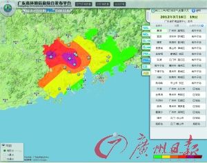 圖為廣東省環(huán)境信息綜合發(fā)布平臺昨日19時發(fā)布的珠三角地區(qū)“最近24小時PM2.5均值分布圖”。圖上深紫色區(qū)域為空氣重度污染區(qū)。