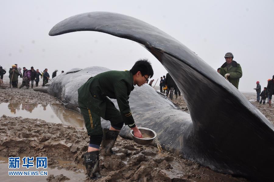 圖為3月17日,邊防官兵在給一頭擱淺的抹香鯨撲水保濕?!∠目?攝 圖片來(lái)源:新華網(wǎng)