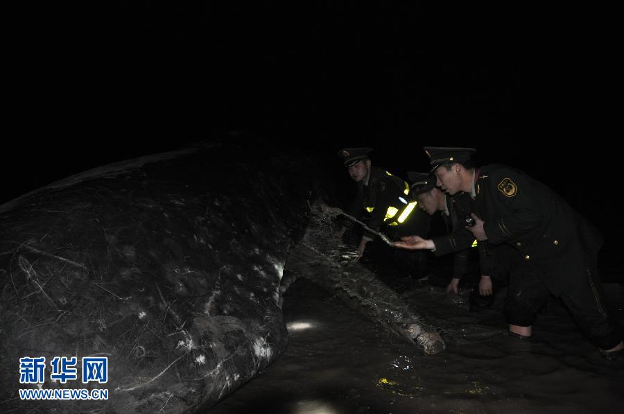 圖為3月16日深夜,邊防官兵在給一頭擱淺的抹香鯨撲水保濕。夏俊 攝 圖片來源:新華網(wǎng)