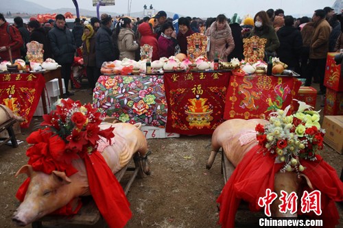3月18日上午,在山東省即墨市田橫鎮(zhèn)周戈莊,漁民們一大早就把生豬、公雞、鱸魚擺在海邊上,焚紙燒香,燃放鞭炮,鑼鼓齊奏,金龍狂舞,將一年一度的祭海盛會(huì)推向高潮。(中新社發(fā)徐崇德 攝)