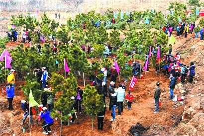 繼3月12日全市黨政軍義務(wù)植樹之后,昨日百果山上又迎來了一個植樹增綠高潮。市城市園林局聯(lián)合本報、交通銀行青島分行發(fā)起的“我為島城添綠”活動在百果山南麓舉行,由500個島城愛心家庭組成的“植綠大軍”栽下了近千株綠樹,將原本光禿禿的山坡變成了綠色濃郁的山林,為緊緊相鄰的世園會園區(qū)增添了一片靚麗的“背景林”。