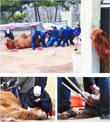 ![]() 在母駱駝生產(chǎn)時,公駱駝一直在觀望,這一場景感動了不少游客??吹今橊勆a(chǎn)時十分痛苦,一位工作人員蹲下?lián)崦?。小駱駝頭部先伸了出來。(記者 孫傳浩 攝) ????世界上最難以愈合的哀傷,是喪子之痛。3月18日上午9時30分,在青島動物園里,一只駱駝媽媽正在忍受著分娩之痛,當時距離其最開始有生產(chǎn)跡象已經(jīng)過去了近17個小時,它也許不知道,在3個小時過后,自己的孩子才剛剛伸出頭來要看看世界,就永遠地閉上了眼睛。4名獸醫(yī)和4名動物飼養(yǎng)員陪護母駱駝?wù)?0個小時,也沒能阻止慘劇的發(fā)生。 ????3月18日上午10時左右,記者來到青島動物園,剛走到駱駝園,還未看到駱駝媽媽,就在距離現(xiàn)場10多米的地方聽到其痛苦的低聲哀鳴聲。記者看到,小駱駝已經(jīng)露出了小腦袋和左前蹄,然而右蹄卡在了母親身體里。為了幫助它盡快出生,工作人員找來了麻繩綁在小駱駝的腿上,奮力將小駱駝往外拉,每當他們一使勁,駱駝媽媽便仰著頭發(fā)出痛苦的哀鳴,痛苦的樣子讓在場的每一個人都心疼不已。 ????在園子旁邊的一個房間里,小駱駝的爸爸把頭伸出柵欄,一直盯著母駱駝,還不斷地喘著粗氣。然而長時間的努力生產(chǎn)幾乎已經(jīng)耗盡了駱駝媽媽的所有體力,只見它疲憊地低著頭,微微閉著眼睛。動物園一位工作人員告訴記者,母駱駝從17日晚上就有了生產(chǎn)跡象,4名飼養(yǎng)員和4名獸醫(yī)一直陪護在它身邊。 ????“駱駝媽媽和駱駝爸爸從昨晚到今天早上一直守在一起,根本就分不開,但是為了接生的需要,我們必須讓它們分開。”工作人員有的使勁推著母駱駝,有的用手活動小駱駝的腿部,有的拽著繩子使勁往外拉,嘗試了30多次,小駱駝還是沒能出來。隨后,記者從現(xiàn)場的飼養(yǎng)員處得知,由于卡住時間太長,而且體質(zhì)非常脆弱,12時 40分左右,小駱駝已經(jīng)完全停止了呼吸。駱駝媽媽仿佛已經(jīng)感覺到自己孩子的離世,卻又無力再看一眼自己的骨肉,只能不停地大聲哀嚎著,而小駱駝的父親則把頭伸出柵欄外,大聲叫著。 ????頭胎難生產(chǎn),只能保大的 ????工作人員稱駱駝體型較大,常因胎位不正導(dǎo)致難產(chǎn) ????雖然小駱駝已經(jīng)停止了心跳,但仍有半個身體停留在母親體內(nèi),工作人員必須盡快地將小駱駝從母親體內(nèi)拖出,以免駱駝媽媽失血過多而危及生命。這時,體力嚴重透支的駱駝媽媽一動不動地躺在地上,任由工作人員往外拖自己的孩子。 ????“按照以往的經(jīng)驗,通常生產(chǎn)都要5個小時以上,在這個過程中隨時都會有各種意外產(chǎn)生,我們只能先保大的,再保小的?!惫ぷ魅藛T告訴記者。 ????經(jīng)過工作人員半個小時的努力,終于用力將小駱駝從母親體內(nèi)拽出。隨后,飼養(yǎng)員用袋子把小駱駝的尸體包裹了起來并帶走,“我們真是怕母駱駝睜開眼睛后看見小駱駝的尸體,它會更傷心?!?/p> ????記者注意到,大部分游客都是第一次見到母駱駝生小駱駝,現(xiàn)場聚集了很多市民?!斑@么巧能看到駱駝生產(chǎn)?!币晃粙寢寧е鴦倳呗返暮⒆优吭跈跅U上觀望,然而看到駱駝媽媽痛苦的樣子,又趕緊用手遮住了孩子的眼睛。血腥的場面讓成年人都接受不了,更何況還未懂事的孩子?!皨寢專●橊勗趺床粍恿搜??”面對孩子的疑問,許多家長都不知道如何向孩子解釋小駱駝的死亡。 ????隨后,記者從動物園的工作人員了解到,這是這頭駱駝第一次生產(chǎn),由于體型較大,特別是小駱駝肩部要比其他部位大很多,由于胎位不正,卡到肩部或者腿部是很常見的情形;不過,“到生第二胎的時候情況就會好很多”。 ????(記者 曹凱杰 實習生 魏瑋) |