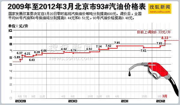 全國汽、柴油價每噸分別提高600元,折合零售價90號汽油和0號柴油每升分別提高0.44元和0.51元。折合成93號汽油,價格將提高0.48元。調價后,93號汽油將從目前的7.85元上調到8.33元。 |