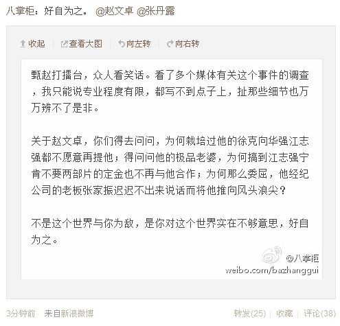 八掌柜稱趙文卓已與徐克等鬧翻 3月20日晚間,微博知名爆料人“八掌柜”連發(fā)兩條微博,分析了甄子丹、趙文卓對峙事件,并接連爆料稱趙文卓與徐克等知名導(dǎo)演關(guān)系不和,女兒加入美國國籍。 “八掌柜”先是于20日18:21發(fā)布一條微博,坦言徐克、向華強(qiáng)、江志強(qiáng)、張家振等名宿,均已與趙文卓鬧翻:“關(guān)于趙文卓,你們得去問問,為何栽培過他的徐克向華強(qiáng)江志強(qiáng)都不愿意再提他;得問問他的極品老婆,為何搞到江志強(qiáng)寧肯不要兩部片的定金也不再與他合作;為何那么委屈,他經(jīng)紀(jì)公司的老板張家振遲遲不出來說話而將他推向風(fēng)口浪尖?不是這個(gè)世界與你為敵,是你對這個(gè)世界實(shí)在不夠意思,好自為之?!?/p> 該微博隨后被大量轉(zhuǎn)發(fā),甄子丹夫人汪詩詩于19點(diǎn)10分轉(zhuǎn)發(fā)該微博,并稱給力。該微博同時(shí)遭到部分挺趙網(wǎng)友的激烈質(zhì)疑。 八掌柜于20點(diǎn)50分再發(fā)一條微博,爆料趙文卓的兒子女兒早已加入美國國籍:“既然這么想聽隱私,那我再曝一料:很多人說甄子丹是美國人,請滾回美國。其實(shí)他是放棄了美國國籍入的香港籍,他是中國人,又有人說香港人請不要欺負(fù)大陸演員,oh,my god,腦殘們,趙文卓的兒子趙子龍,香港籍,女兒名叫Rosita,美國籍。”(彌爾) |