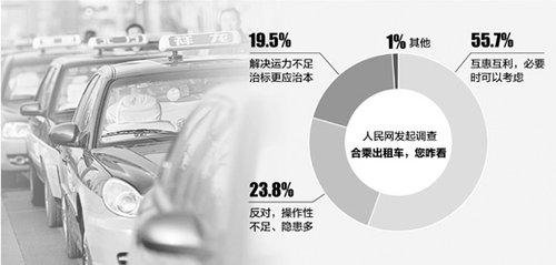 據(jù)統(tǒng)計(jì),我國(guó)合法營(yíng)運(yùn)的出租車目前已超百萬輛,行駛中只載單一乘客的出租車約占70%。北京、上海、南京等大城市一些人士認(rèn)為,鼓勵(lì)合乘出租車既能減少出租車資源、燃油、司機(jī)時(shí)間的浪費(fèi),從而減輕出租車整體運(yùn)營(yíng)壓力、促進(jìn)環(huán)保,也能緩解市民出行難的壓力。