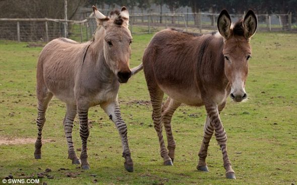 飼養(yǎng)員說,雄斑馬與雌驢所生的雜交斑驢茲伊(左)和斑馬和驢的雜交斑驢澤姆比(右)看起來更像驢子,卻有斑馬的性情。