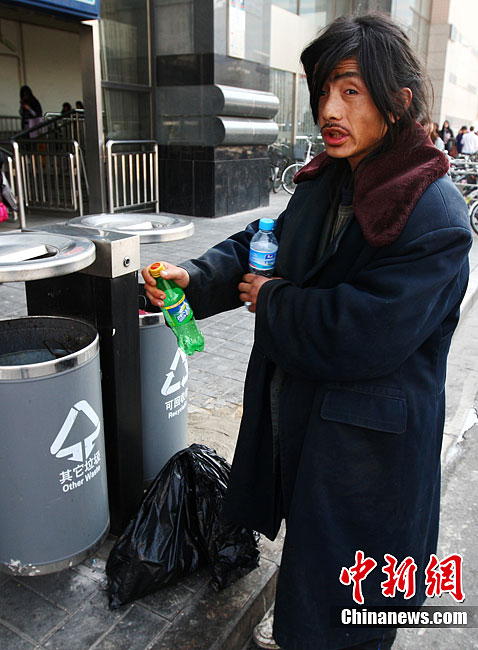 近日,一位在西單圖書大廈周圍靠撿瓶子為生的“犀利哥”走紅網(wǎng)絡(luò)?!跋纭敝苄裾f他是北京人,從小就喜歡看球,喜歡國安隊,可父母不同意,因此,16歲時他就離家出走,從此周旭開始獨自生活。因為一身邋遢的衣服,靠撿瓶子買年票觀看國安比賽,29歲的周旭人稱“國安犀利哥”。為買國安年票要撿4000個瓶子,這需要周旭兩個月的時間。圖為3月27日,犀利哥在西單撿瓶子。(中新社記者劉關(guān)關(guān)攝)