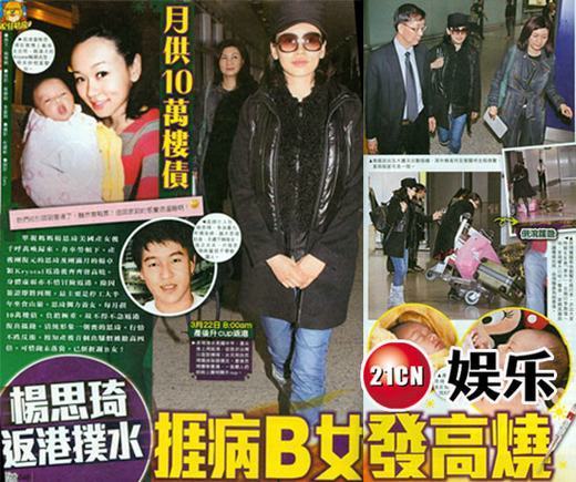 單親媽媽楊思琦美國(guó)產(chǎn)女后千呼萬(wàn)喚歸來(lái),舟車(chē)勞頓下,產(chǎn)后剛復(fù)元的楊思琦及剛滿月的楊卓穎返港后齊齊發(fā)高燒。身體虛弱亦不惜冒險(xiǎn)返港,除因簽證即將到期,最主要是停工大半年坐食山崩,楊思琦獨(dú)立養(yǎng)女兒,每月背10萬(wàn)樓債,負(fù)擔(dān)極重,顧不得不急返港復(fù)出賺錢(qián)。清純形象盡喪的楊思琦,行情不跌反漲,據(jù)知產(chǎn)后首個(gè)活動(dòng)酬勞已被搶高四倍,可惜錢(qián)未賺,已經(jīng)搞壞女兒的身體。