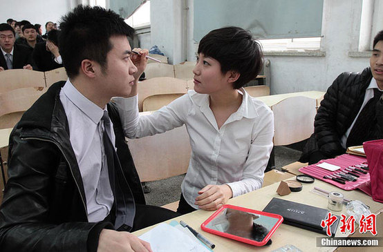 3月29日,在長春工業(yè)大學,來自長春各高校700余名帥哥靚女應招乘務(安全)員。據(jù)了解,這是南航首次進入吉林省高校校園招聘空乘人員,預計在長春招聘70-100人左右。在長春的招聘現(xiàn)場,僅一上午就引來700多人應聘,場內(nèi)面試緊張進行,場外等候的俊哥靚女們也不停地對鏡梳妝,希望能給面試人員留下好印象。圖為互相幫忙化妝。