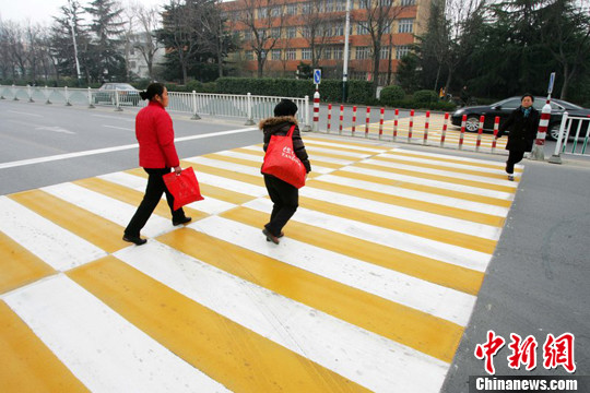 3月29日,山東濰坊,市民從勝利街“彩色斑馬線”前經(jīng)過。