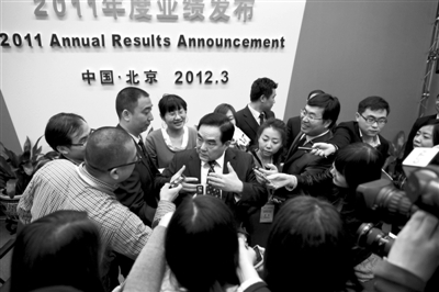 昨日發(fā)布會后,工行行長楊凱生受訪。本報記者 周崗峰 攝