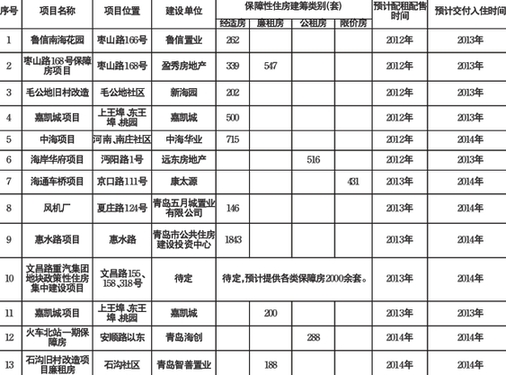 ????3月30日,記者在青島李滄區(qū)政務網(wǎng)上看到,該區(qū)公布了2012年保障性住房建設及配租配售的明細表。從表格中,記者了解到,2012年李滄區(qū)一共要建設的保障性住房項目有13個,建設房屋一共8000余套,其中僅文昌路重汽集團地塊政策性住房集中建設項目就預計提供各類保障房2000余套。而在13個項目中,預計配租配售時間在今年的項目有6個,預計交付入住時間在明年的項目也有6個。