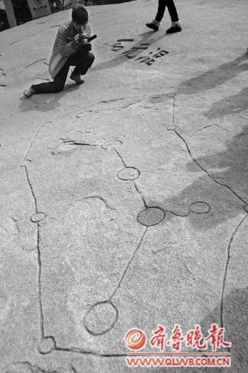 一幅長(zhǎng)約3米、寬近2米的“北斗七星陣圖”石刻,近日現(xiàn)身青島嶗山仰口游覽區(qū)。該石刻疑為1000多年前道教弟子辨別時(shí)節(jié)方位、養(yǎng)生所用。(記者 張曉鵬 實(shí)習(xí)生 邱曉宇 攝影報(bào)道)