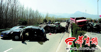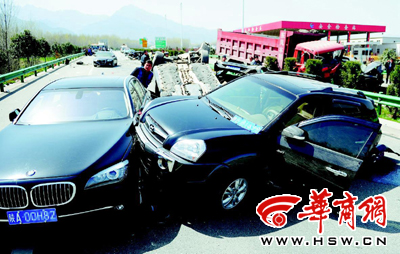 車禍現(xiàn)場,迎親車隊(duì)的車輛被撞得七零八落(趙雄韜 攝) “死里逃生??!”看著現(xiàn)場寶馬、奔馳、奧迪等8輛幾乎報(bào)廢的車輛,靳先生驚魂未定。昨日上午11點(diǎn)左右,這支迎親車隊(duì)剛上高速就和一輛載滿砂石的大卡車相撞,車禍致20人受傷,其中6人重傷。 10車連撞 損失至少200萬元以上 昨日上午10時(shí)許,包茂高速太乙宮段往西安方向車道封閉,一輛大卡車和9輛“受傷”的小轎車停在路上,現(xiàn)場一片狼藉。 最前頭是一輛尾巴被撞飛的現(xiàn)代越野車,“現(xiàn)代”右后方是輛寶馬,寶馬面目全非;正后方是一輛“四腳朝天”的奔馳,玻璃碴碎了一地;左后方則也是一輛奔馳,車門和車頭完全變形。 在它們后方則是一輛大卡車,大卡車已沖破高速路中央的綠化隔離帶,同時(shí)將一輛奧迪Q7也“推”到了路對面行車道上,車前蓋、車頭完全不成樣子。 卡車后方數(shù)十米遠(yuǎn)處,還是一些“受傷”的豪車,奧迪、寶馬、奧迪、奔馳4輛車先后被撞“毀容”,“估計(jì)要報(bào)廢了?!币幻氛ぷ魅藛T說。在這些被撞車后方約三十米處,車道右側(cè)的隔離欄也被撞彎。 高速路面上,機(jī)油污染了大片的面積。“Q7看樣子已經(jīng)完全報(bào)廢了,那輛寶馬也估計(jì)夠嗆?!睅孜卉囍髟谝黄鸫篌w算了算,車禍保守估計(jì)造成了200萬元以上的損失。 卡車失控 司機(jī)“跳車”當(dāng)場昏迷 三位車主介紹說,他們的車是借給了朋友作為婚禮用車,從藍(lán)田接到新娘后,由20多輛車組成的婚禮車隊(duì)在太乙宮上了高速,準(zhǔn)備到西安舉辦婚禮,沒有想到剛上高速就出了事。 “我在最后那輛奔馳的副駕駛座上?!苯壬f,車隊(duì)從太乙宮剛上高速,車速不高,無意中他在車輛右后視鏡上看到,一輛卡車撞到了右側(cè)的隔離欄,“卡車的車速沒有減,又從緊急停車帶向我們撞過來了?!苯壬f,他們的司機(jī)趕緊向超車道上打了一把方向,卡車撞到了他們車的右后部,但前面的奧迪和寶馬等車先后被卡車撞擊。 “把我們后面的這幾輛車撞了之后,大卡車的司機(jī)就跳車了?!苯壬nD了一下說:“也不知道是自己跳車的還是從車?yán)锼Τ鰜淼?。”“卡車司機(jī)‘跳車’后當(dāng)場就昏迷了,我們也不知道他是疲勞駕駛、方向失靈還是剎車失靈?!苯壬f,事故原因還不得而知。 受傷情況 車禍導(dǎo)致20人受傷 昨日上午事故發(fā)生后,路政工作人員已將道路封閉,將過往車輛分流,昨日中午時(shí)分交通恢復(fù)暢通。公安長安分局隧道警察大隊(duì)民警已對事故原因展開調(diào)查。 靳先生說,除那輛現(xiàn)代不是婚禮車外,剩余被撞的8輛車全都是婚禮車,但其他的婚禮車沒有受到影響,也沒有影響到婚禮的舉行。 據(jù)了解,此次車禍導(dǎo)致20人受傷,其中6人重傷。15名傷者被送往航天醫(yī)院,5名被送往交大一附院。 昨日中午,在航天醫(yī)院急診科外的走廊上,一名頭部有傷的小伙子說,他也是車禍中受傷的,“但我的這點(diǎn)傷是外傷,能看見,也不要緊?!彼f,參加婚禮的每輛車上有3到4個(gè)人,有些朋友的傷不重,干脆都沒有在醫(yī)院治療。 “車禍送來了十五六個(gè)傷員,有的傷勢比較輕,但有3名傷員傷勢相對比較重,目前正在接受救治?!焙教灬t(yī)院急救科醫(yī)生說。(何杰) |