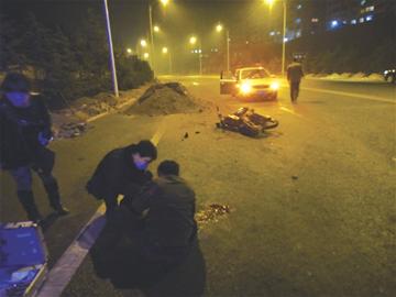 “我晚上剛跟朋友聚會,稍微喝了一點啤酒,但神志仍然很清楚,當(dāng)時我駕駛著摩托車馬上就要到家了,根本沒想到馬路上會出現(xiàn)土堆?!庇浾咴诰茸o(hù)車上見到了受傷的摩托車司機(jī)董師傅,他臉上滿是鮮血,右眼角撕裂,周圍高高腫起,已經(jīng)看不清東西,同樣撕裂的還有上嘴唇。他告訴記者,自己當(dāng)時的車速并不是很快,因為雨水會遮擋視線,所以沒有戴上頭盔。事發(fā)現(xiàn)場附近沒有居民家的燈光,路燈又比較昏暗,這個土堆隱藏在陰影里,從遠(yuǎn)處很難發(fā)現(xiàn)。他看到土堆時已來不及剎車,摩托車沖進(jìn)土堆里失控了,他感覺自己被甩了出去,接著就昏迷了。
