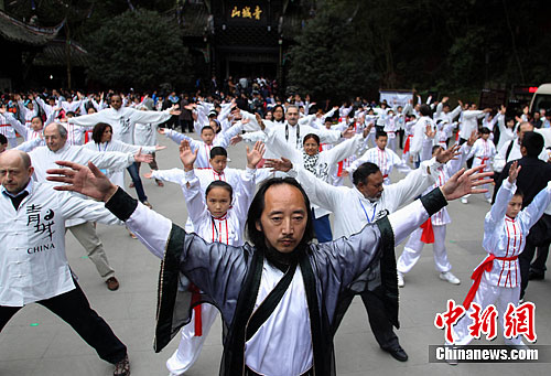 4月3日,包括15名駐華大使在內(nèi)的32個國家的駐華使節(jié)來到四川青城山,在青城派掌門、青城太極大師劉綏濱的示范指導(dǎo)下練習(xí)青城太極。中新社發(fā)蘇丹 攝