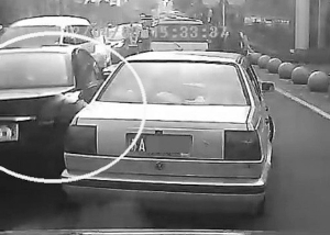 遮住前后牌照的黑色別克轎車在擁擠的道路上橫沖直撞,先后碰上12輛車子后,迅速逃離。(畫圈處為肇事車輛)