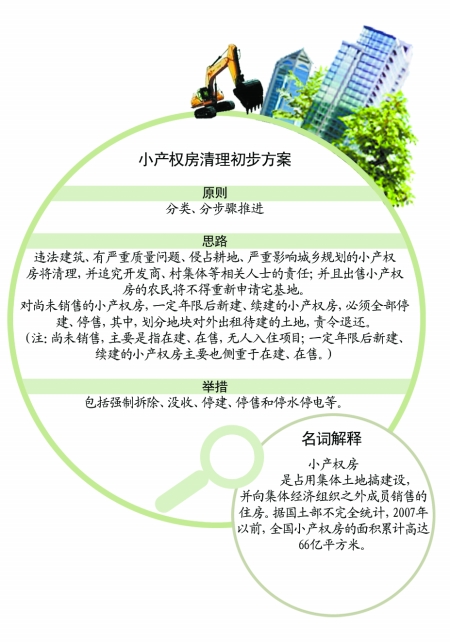 小產(chǎn)權(quán)房清理初步方案 3月29日,國(guó)土部知情人士介紹,“由國(guó)土部牽頭、14個(gè)部委參與研究制定的小產(chǎn)權(quán)房初步清理整治政策方案此前已上報(bào)給國(guó)務(wù)院?!?/p> 小產(chǎn)權(quán)房的清理思路原則是分類、分步驟推進(jìn)。其中,侵占耕地等違法違規(guī)的小產(chǎn)權(quán)房,尚未銷售以及新建、續(xù)建的小產(chǎn)權(quán)房,有望列入清理范圍。但具體銷售和建設(shè)的時(shí)間點(diǎn)、何時(shí)正式展開(kāi)清理,尚待最后方案出臺(tái)才能敲定。 清理范圍 未售、新建的小產(chǎn)權(quán)房 據(jù)上述國(guó)土部知情人士介紹,小產(chǎn)權(quán)房清理的一個(gè)原則是:區(qū)別對(duì)待、分類處置。 其中,尚未銷售的小產(chǎn)權(quán)房,一定年限后新建、續(xù)建的小產(chǎn)權(quán)房,必須全部停建、停售(具體思路詳見(jiàn)上圖)。 他同時(shí)指出,國(guó)土部對(duì)“一定年限”的要求曾以2008年為限,因?yàn)楫?dāng)年曾為國(guó)務(wù)院報(bào)告過(guò)小產(chǎn)權(quán)房的初步處理意見(jiàn),而由于種種原因?qū)嶋H工作中推行困難。 “最新的時(shí)間點(diǎn),需要等到全國(guó)小產(chǎn)權(quán)房新的清理方案出臺(tái)后作出安排?!痹撊耸糠Q。 清理辦法 “包括強(qiáng)制拆除、沒(méi)收” 就清理舉措看,上述人士介紹,“包括強(qiáng)制拆除、沒(méi)收、停建、停售和停水停電等?!?/p> 而針對(duì)已售、已長(zhǎng)期居住的小產(chǎn)權(quán)房,上述人士稱,“方案征求意見(jiàn)階段,各部委對(duì)此并未形成統(tǒng)一意見(jiàn),地方政府也有自己的一套思路,還未達(dá)成一致?!?/p> “短期看,只能先選擇小產(chǎn)權(quán)房問(wèn)題嚴(yán)重的地區(qū)做試點(diǎn);與此同時(shí),國(guó)土部將抓緊摸底全國(guó)小產(chǎn)權(quán)房的確切數(shù)據(jù)?!鄙鲜鰢?guó)土部知情人士稱。 據(jù)國(guó)土部土地利用司的一位不愿具名的人士介紹,年底即將完成的全國(guó)農(nóng)村集體土地確權(quán)登記的數(shù)據(jù),將成為未來(lái)小產(chǎn)權(quán)房清查的主要參考。 清理試點(diǎn) 北京、重慶、鄭州、??诳赡茉圏c(diǎn) 小產(chǎn)權(quán)房清理方案懸而未決,試點(diǎn)城市也難推進(jìn)。 國(guó)土部該知情人士介紹,小產(chǎn)權(quán)房清理思路未明,國(guó)土部正在和各部委以及地方政府溝通,明確試點(diǎn)城市。 此前有媒體消息稱,國(guó)土部將在北京、重慶、鄭州、??诘刃‘a(chǎn)權(quán)房較密集的城市開(kāi)展試點(diǎn)。 專家介紹,上述四個(gè)城市較具代表性,北京郊區(qū)小產(chǎn)權(quán)房密集,高房?jī)r(jià)將大量剛需族逼向了郊區(qū)小產(chǎn)權(quán)房;重慶屬西部大城市,外來(lái)人口多,郊區(qū)面積大,小產(chǎn)權(quán)房分布零散;鄭州小產(chǎn)權(quán)房的城中村問(wèn)題突出;??诼糜味燃賲^(qū)存在大量小產(chǎn)權(quán)房問(wèn)題。 清理障礙 部分地方、個(gè)別部委抵觸 “國(guó)土部正在和部分地方溝通小產(chǎn)權(quán)房清理試點(diǎn)工作,從目前來(lái)看,很難推進(jìn)。”上述國(guó)土部知情人士說(shuō),“來(lái)自于地方政府和相關(guān)部委的阻力較大?!?/p> “部分地方政府、個(gè)別部委在地方的重大項(xiàng)目工程,部分存在違法違規(guī)用地情況,一旦摸底,地方違法違規(guī)的用地問(wèn)題將無(wú)處遁形。”該人士稱,“在和地方政府的溝通中,地方政府普遍反映,希望部分符合規(guī)劃、質(zhì)量合格的小產(chǎn)權(quán)房,在補(bǔ)交土地出讓金后轉(zhuǎn)正,或者轉(zhuǎn)為保障房?!?/p> 據(jù)接近住建部的人士稱,如果收歸為保障房,可能存在政府為小產(chǎn)權(quán)房正身的嫌疑,間接承認(rèn)小產(chǎn)權(quán)房的合法性;而回收小產(chǎn)權(quán)房的價(jià)格如何確定、如何確保保障房公平公正,還需要再深入探討。 【聲音】 “僅采取沒(méi)收、強(qiáng)制拆除、停建和斷水?dāng)嚯姷取隆拇胧?,無(wú)法從根本上解決小產(chǎn)權(quán)房問(wèn)題?!?/p> ——中國(guó)人民大學(xué)公共管理學(xué)院副院長(zhǎng)嚴(yán)金明 “現(xiàn)行《土地管理法》雖然明確小產(chǎn)權(quán)房性質(zhì)的非法性,但地方陸續(xù)有一些自行流轉(zhuǎn)的集體土地試驗(yàn),對(duì)于新的流轉(zhuǎn)現(xiàn)象如何監(jiān)管,辦法并不清晰?!薄憬髮W(xué)土地管理學(xué)院教授楊磷杰 “小產(chǎn)權(quán)房清理,須和房地產(chǎn)調(diào)控一盤(pán)棋梳理。要會(huì)同有關(guān)部門,研究土地收益城鄉(xiāng)統(tǒng)籌使用的辦法?!薄?cái)政部相關(guān)人士 “政府在小產(chǎn)權(quán)房清理的政策執(zhí)行上一直久拖不決,應(yīng)找到一個(gè)時(shí)間節(jié)點(diǎn),嚴(yán)格地區(qū)分過(guò)去和將來(lái),這是非常迫切的問(wèn)題。”——中國(guó)房地產(chǎn)經(jīng)理人聯(lián)盟秘書(shū)長(zhǎng)陳云峰 |
