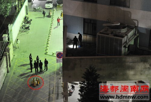 一只穿著黑襪的腳(畫圈處)掉落在路面,警方在一旁的大廈露臺現(xiàn)場勘查。 人走路上,突然,一旁的高樓飛落下來一只斷腳。昨日下午6時許,如此驚悚的一幕,出現(xiàn)在泉州市區(qū)溫陵路蟠龍大廈后門的小路上。有該樓業(yè)主稱,死者為女性,身首異處,橫尸大樓2層外的平臺上。 今晨,泉州市公安局知情人士透露,警方初判為自殺,系砸到樓層肢解。 昨晚7時,記者趕到現(xiàn)場。蟠龍大廈正門和斷腳所在的后門小路已被警方封鎖。斷腳位于大廈后門靠北一側(cè)路中間,警方封鎖現(xiàn)場后,用一紙箱將其蓋住。 法醫(yī)拿起紙箱檢查斷腳時,記者發(fā)現(xiàn),斷腳是只左足,腳型較小,疑為女性,穿黑襪。斷裂處位于腳踝上方約5厘米,斷面并不整齊。 大廈北側(cè)2層外有一突出的三角形露臺,記者看到,多名民警和法醫(yī)在露臺上勘查,時間很長。據(jù)市民和大廈業(yè)主稱,死者尸體的其余部分位于露臺上。 大廈業(yè)主馬先生稱,聽到現(xiàn)場經(jīng)辦民警說,在31層的陽臺上,留有一只眼鏡和一雙鞋子,由此推斷她是從31層墜樓的,人墜落至2層的露臺時,左腳跌斷了,從露臺飛到地面上。周邊居民也稱,在警方尚未到達(dá)現(xiàn)場時,大廈保安也曾向他們透露過類似的信息。 昨晚8時,記者看見民警從大廈內(nèi)取出一副紅褐色邊框眼鏡和一雙淺褐色高跟女短靴,法醫(yī)對兩件物品進(jìn)行了拍照取證。記者在現(xiàn)場還聽聞民警在交談中提及,死者疑為大廈住戶,是名已婚女子。 另一不愿具名的大廈業(yè)主表示,從樓上看到了女子的橫尸現(xiàn)場——女子身首異處,相距半米多,橫尸2層露臺上。因當(dāng)時天色已暗,該業(yè)主稱無法看清女子的面容和所穿衣物,但能分辨出女子的長發(fā),且露臺地面無明顯血跡。 |