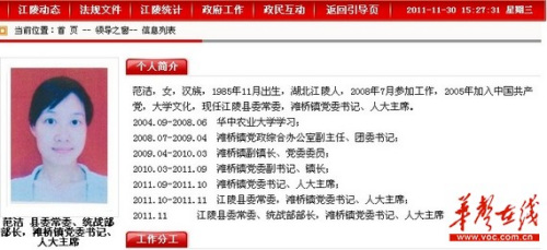 在江陵縣人民政府網(wǎng)站“領(lǐng)導(dǎo)之窗”欄目中,記者找到范潔的簡(jiǎn)歷,其內(nèi)容與網(wǎng)帖所述一致。