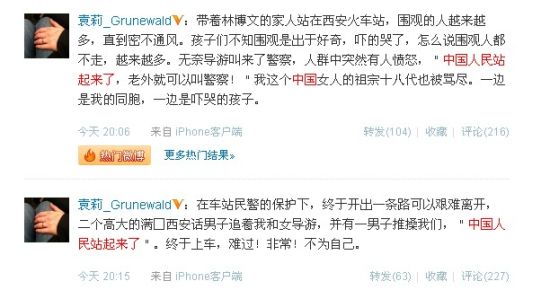 袁立于4月9日20點06分發(fā)布微博稱:“帶著林博文的家人站在西安火車站,圍觀的人越來越多,直到密不通風。孩子們不知圍觀是出于好奇,嚇的哭了,怎么說圍觀人都不走,越來越多。無奈導游叫來了警察,人群中突然有人憤怒,‘中國人民站起來了,老外就可以叫警察!’我這個中國女人的祖宗十八代也被罵盡。一邊是我的同胞,一邊是嚇哭的孩子?!?/p>