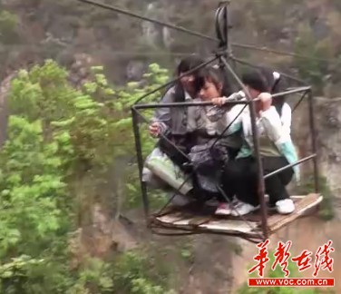 ????這段5分鐘的視頻中,在懸洞子大峽谷140米高的上空,溜索穿越80米寬的山崖兩邊,連通著人們的往來(lái)。上學(xué)過(guò)溜索時(shí),孩子們蜷縮著身子,擠進(jìn)由一些鐵棒焊接而成的籠子里,敞空的鐵籠用溜索吊在鋼繩上,過(guò)索道要依靠人力牽引繩子才可前進(jìn)到達(dá)對(duì)面。這看似像在旅游景點(diǎn)坐纜車(chē),只是在這偏僻的深山里,“纜車(chē)”懸在半空中時(shí),心也懸在半空中!