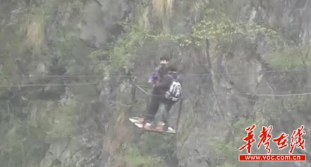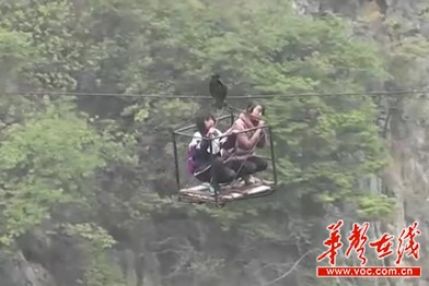 ????學(xué)生乘鐵籠般的劃索過(guò)140米懸崖上學(xué)