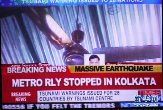 這是4月11日在印度首都新德里拍攝的播報印度尼西亞地震的新聞畫面。據(jù)中國地震臺網(wǎng)中心網(wǎng)站消息,蘇門答臘北部附近海域,北京時間4月11日16時38分,發(fā)生里氏8.6級地震。印度金奈、班加羅爾、加爾各答等地震感明顯,加爾各答地鐵暫時停運(yùn),印度安達(dá)曼和尼科巴群島地區(qū)發(fā)布海嘯警報。新華社記者李毅剛攝