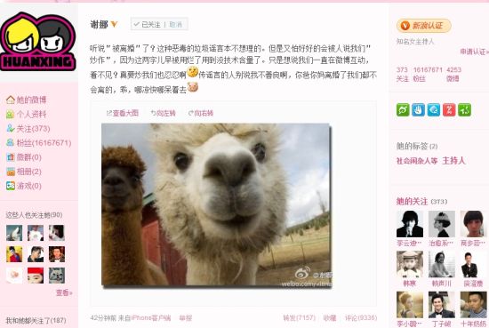 ![]() 謝娜微博貼草泥馬大頭照駁斥離婚傳聞
