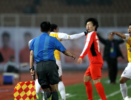 在此期間,央視的轉(zhuǎn)播鏡頭直接轉(zhuǎn)向了青島球迷,而頗具意味的是,青島球迷在賽前布置的助威條幅出現(xiàn)在畫面上,“鄭龍生日快樂”。經(jīng)過了4分鐘的暫停之后,比賽恢復(fù)。主裁判向鄭龍出示了紅牌,被罰下場(chǎng)。然而當(dāng)比賽再次恢復(fù)的時(shí)候,全場(chǎng)球迷又一次喊出了“申鑫傻X”“傻X申鑫”的漫罵語(yǔ)。