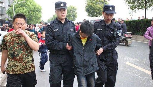 2012年4月13日晚,衡陽縣西渡鎮(zhèn)突發(fā)一起特大命案,一名12歲的小男孩用水果刀將姑媽一家三口殺害。經(jīng)進一步偵查,于14日上午9時30分將肖某抓獲,當(dāng)場從其身上搜出其姑姑家房門鑰匙、手機及2000元現(xiàn)金等物。犯罪嫌疑人肖某對殺死其姑姑及表弟表妹的事實供認(rèn)不諱。圖為犯罪嫌疑人被抓捕歸案。