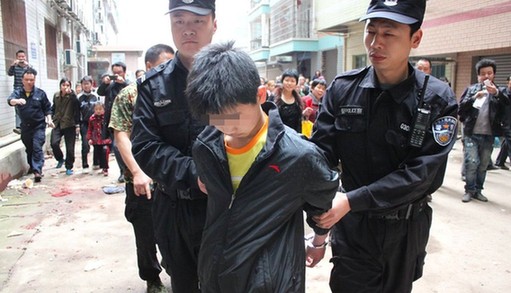 犯罪嫌疑人肖某2000年2月19日出生,衡陽縣峴山鄉(xiāng)靈官村人,現(xiàn)為該縣城某中學初一寄宿學生,假期寄居姑姑家。9年前,父母離異,缺乏家庭溫暖,對姑姑管教甚嚴產(chǎn)生抵觸情緒。4月13日下午,其放假后回到姑姑家,因姑姑不在家,晚餐無著落,肖某頓生怨恨,將放學回家的表弟表妹殺害,未等離開,又將接著回家的姑姑殺害,草率清理現(xiàn)場后逃離。圖為4月14日,犯罪嫌疑人被抓捕歸案。