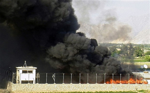 東部城市賈拉拉巴德市,北約重建小組大樓先后遭自殺式炸彈和汽車炸彈襲擊,燃起濃煙。