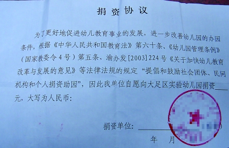 學(xué)校發(fā)的“捐資協(xié)議” 受訪者供圖 家住大足區(qū)的仇勇(化名)有一個(gè)兩歲半的孫女,在大足區(qū)實(shí)驗(yàn)幼兒園上學(xué)。前幾天,仇勇帶著孫女去幼兒園時(shí),收到學(xué)校發(fā)的一份“捐資協(xié)議”。幼兒園老師告訴仇勇,需要仇勇以自己?jiǎn)挝坏拿x向幼兒園繳納500元/年的捐資助學(xué)費(fèi),而且還要在“捐資協(xié)議”蓋上單位的公章。 “這完全是變著花樣讓我們交捐資助學(xué)費(fèi)!”昨日,仇勇氣憤地說(shuō),他已經(jīng)向教委反映此情況 家長(zhǎng): 孩子要上學(xué)得先捐資 昨日,仇勇告訴記者,自己的孫女在大足區(qū)實(shí)驗(yàn)幼兒園讀早教班,每周周末上一次課。讀完早教班,孫女明年就準(zhǔn)備進(jìn)入該幼兒園幼兒小班正式上學(xué)了。上周六,仇勇帶著孫女去上課,收到幼兒園發(fā)的一份“捐資協(xié)議”。 “幼兒園老師告訴我,孫女如果要在幼兒園上學(xué),每年就要交500元捐資助學(xué)費(fèi),讀三年,需要一次性將1500元繳完”,仇勇表示,幼兒園讓孩子家長(zhǎng)找其所工作的單位捐資助學(xué),并且還要求讓單位在“捐資協(xié)議”上蓋公章。 “讓單位給員工子女交捐資助學(xué)費(fèi),這可能么?出錢的最后還不是我們自己!我們不愿意交也得交,畢竟孩子要上學(xué)”,仇勇質(zhì)疑說(shuō),這完全是幼兒園為了規(guī)避相關(guān)政策而搞的“怪名堂”。 幼兒園: 只是讓家長(zhǎng)找單位捐款 通過(guò)網(wǎng)絡(luò),仇勇給記者傳了一張翻拍的“捐資協(xié)議”照片。記者看到,該協(xié)議上寫著“我單位自愿向大足區(qū)實(shí)驗(yàn)幼兒園捐資元”字樣,而在協(xié)議末尾“捐資單位”一欄,仇勇已經(jīng)找單位蓋了一個(gè)公章。 昨日下午,記者聯(lián)系上大足區(qū)實(shí)驗(yàn)幼兒園,一名自稱園長(zhǎng)助理的工作人員解釋稱,幼兒園得到的捐資助學(xué)款將用于幼兒園的基礎(chǔ)建設(shè)。 “捐資助學(xué)費(fèi)的繳納完全是出于家長(zhǎng)自愿,不愿意繳我們也不會(huì)強(qiáng)迫”,該工作人員表示,幼兒園只是讓家長(zhǎng)去找其所在單位捐款,并不是強(qiáng)迫家長(zhǎng)繳納捐資助學(xué)費(fèi)。 隨后,這名工作人員以自己不方便聊、幫記者找園長(zhǎng)為由,匆忙掛斷了電話。 回應(yīng) 大足區(qū)教委:已著手展開調(diào)查 昨日,記者就此事向大足區(qū)教委進(jìn)行了反映?!案鶕?jù)今年年初國(guó)家發(fā)展改革委、教育部、財(cái)政部制定《幼兒園收費(fèi)管理暫行辦法》,無(wú)論是公立還是民辦,幼兒園不得以任何名義向幼兒家長(zhǎng)收取與入園掛鉤的捐資助學(xué)費(fèi)等費(fèi)用”,大足區(qū)教委副主任伍天澤告訴記者。 據(jù)悉,《幼兒園收費(fèi)管理暫行辦法》第12條規(guī)定,幼兒園不得以任何名義向幼兒家長(zhǎng)收取與入園掛鉤的贊助費(fèi)、捐資助學(xué)費(fèi)、建校費(fèi)、教育成本補(bǔ)償費(fèi)等費(fèi)用。第13條則規(guī)定,社會(huì)團(tuán)體、個(gè)人自愿對(duì)幼兒園的捐資助學(xué)費(fèi),按照國(guó)家《公益事業(yè)捐贈(zèng)法》和有關(guān)社會(huì)捐助教育經(jīng)費(fèi)的財(cái)務(wù)管理辦法執(zhí)行。 大足區(qū)教委稱對(duì)此事已展開調(diào)查,目前尚未確定大足區(qū)實(shí)驗(yàn)幼兒園是否違規(guī)收取捐資助學(xué)費(fèi)。(記者 吳光亮) |